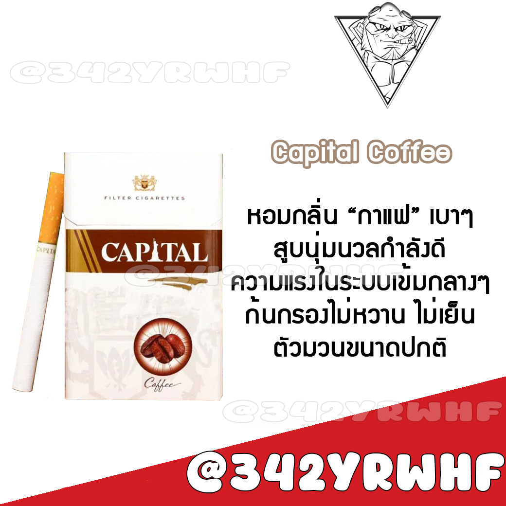 Capital Coffee ร้อน ไม่มีเม็ดบีบ หอมกลิ่น “กาแฟ” เบาๆ สูบนุ่มนวลกำลังดี ความแรงในระดับเข้มกลางๆ ก้นกรองไม่หวาน ไม่เย็น ตัวมวนขนาดปกติ